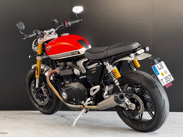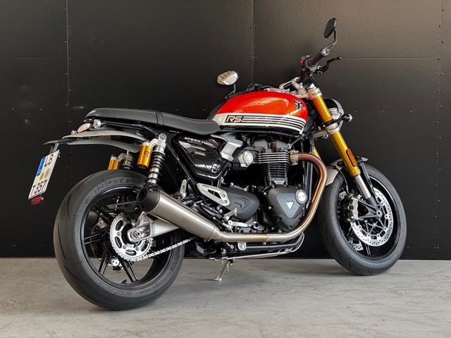 Mit hochwertiger Ausstattung wie Öhlins-Fahrwerk, Brembo-Monoblock-Bremsen, Kurven-ABS und Traktionskontrolle bietet die Speed Twin RS präzises Handling und höchste Fahrstabilität egal, ob auf kurvigen Landstraßen oder in der Stadt. Das leichte Fahrwerk und die ausgewogene Ergonomie sorgen für ein direktes, souveränes Fahrgefühl, das sportliche Ambition und Alltagstauglichkeit perfekt vereint.
